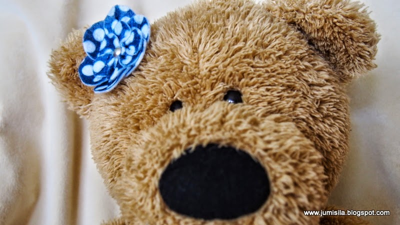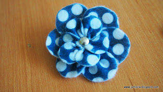 Gdy tylko zobaczyłam wzorzysty filc pomyślałam, że muszę go mieć. Okazał się mięciutki (wszystkie poprzednie grubości filcu miałam sztywne), co mnie bardzo ucieszyło i zrobiłam z niego upragnioną broszkę. Niestety wzorzysty filc jest barwiony tylko jednostronnie. Powstałą broszkę zgodził się zaprezentować miś. Muszę go pochwalić - bardzo cierpliwie pozował :) Na pierwszą broszkę wybrałam granatowy filc w białe groszki. Kiedyś nie przepadałam za tym wzorem, ale gusta się zmieniają i bardzo mi się podoba.